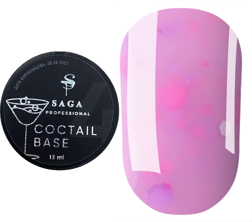 Saga Coctail Base №03 (рожевий з пластівцями) 13 мл — камуфлююча база рожевого кольору з різнокольоровими пластівцями. Представляємо нову колекцію кольорових баз Coctail. База легко наноситься на нігті, приховуючи дрібні недоліки. Засіб самовирівнюється і не вимагає додаткового опила, пластівці рівно розподіляються по нігтю і не стовбурчаться. Така база не обтяжує нігтьову пластину, з нею можна пропустити етап нанесення кольорового гель-лаку, при цьому манікюр виглядатиме елегантним та якісним.
