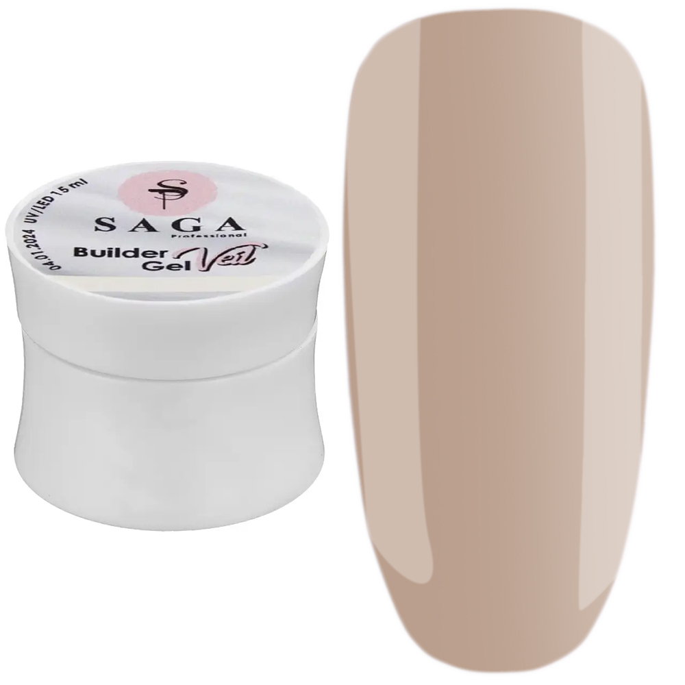 Saga Professional Builder Gel Veil - лінійка жорстких, не гнучких гелів, розроблених для нарощування та зміцнення нігтів. Мають середню за густотою консистенцію, низькокислотні. Підходять до роботи з нижніми формами. Адаптовані до техніки "без опила". Вимагають підкладки. Не дають усадки. При полімеризації можуть нагріватися та викликати невелике печіння.