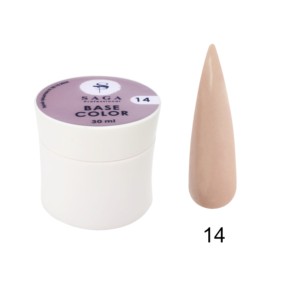 Saga Color Base №14 (молочно-бежевий) 30 мл – камуфлююча база для гель-лаку з нової колекції кольорових баз від бренду Saga. База має напівпрозору середню жорсткість текстуру, відмінно лягає і розподіляється на нігтьовій пластині, має зміцнюючі властивості, підходить для довгих нігтів. Не вимагає попереднього шару грунтовки і може наноситися як самостійне колірне рішення під топ. Об'єм 30 мл.