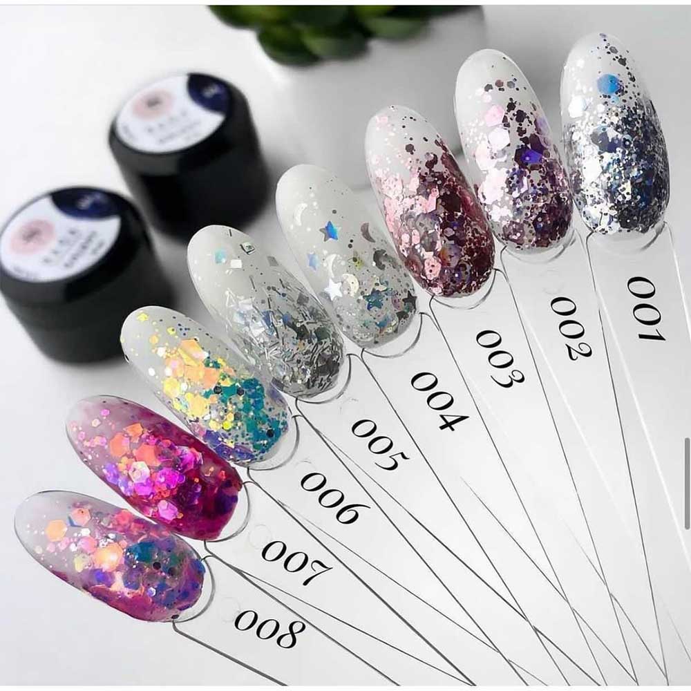 Гель Galaxy Glitterвід виробника SagaProfessional це інноваційний дизайн-гель для нігтів, до складу якого входить різнокольоровий глітер, брокат і фольговані елементи різних розмірів та форм. Glittergel застосовується як декоративне покриття. Гель має щільну консистенцію, легко наносити та рівномірно розподіляти по нігтьовій пластині. Гель для нігтів Saga ідеально підходить для святкового образу, щоб створити яскравий, блискучий, мерехтливий манікюр. Гель із гліттером можна використовувати самостійно, на кольоровій гель-лаковій підкладці, для дизайну з розтяжкою, а також при моделюванні викладного френча. Наносити можна як на натуральні нігті, так і штучні.