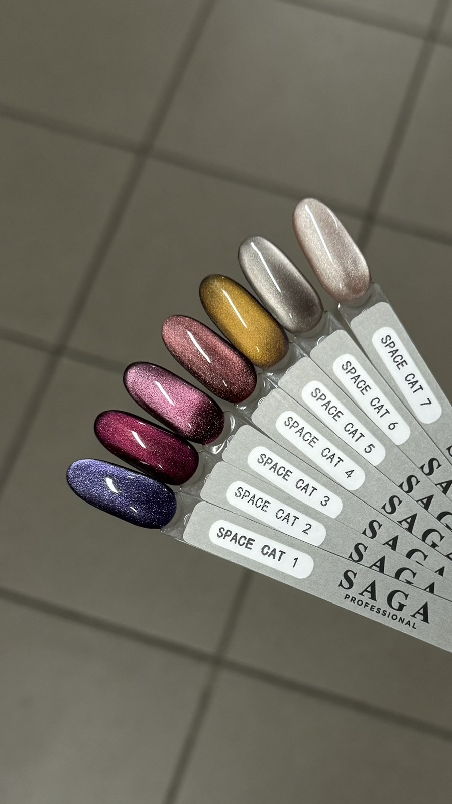SAGA Professional Gel Polish Space Cat, 10 мл— ефектний гель-лак з магнітним ефектом «котяче око», натхненний глибиною космосу. Насичений пігмент у поєднанні з дрібними магнітними частинками створює об’ємний, світловий відблиск, який змінюється залежно від кута освітлення.