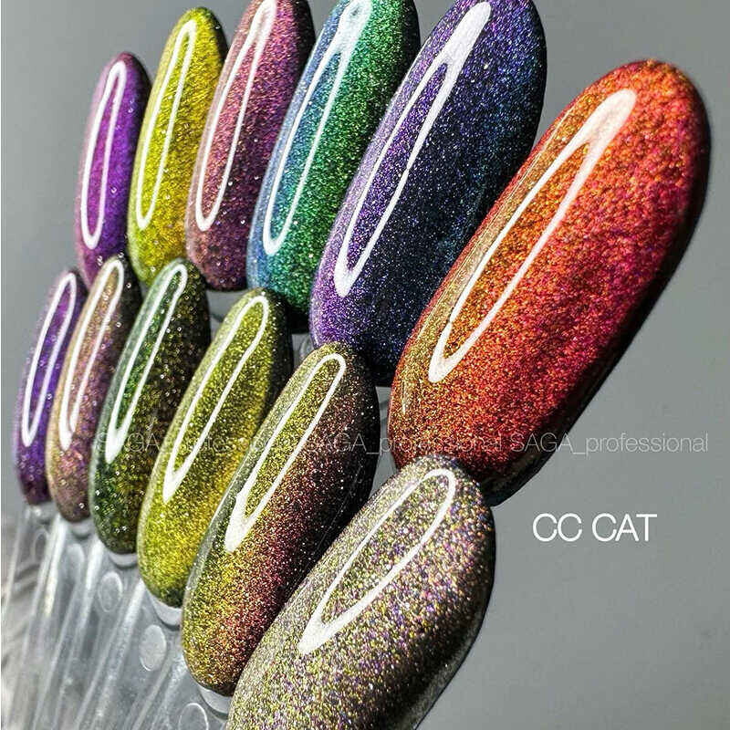 Saga Professional Wild Cat - колекція гель-лаків, які сліпуче сяють і мають властивість реагувати на магніт (ефект "котяче око"). Переливаються трьома різними відтінками. Мають оптимальну щільність, тому ідеально перекривають ніготь одним вирівнюючим шаром. При бажанні можна наносити двома шарами, а також на чорну підкладку.