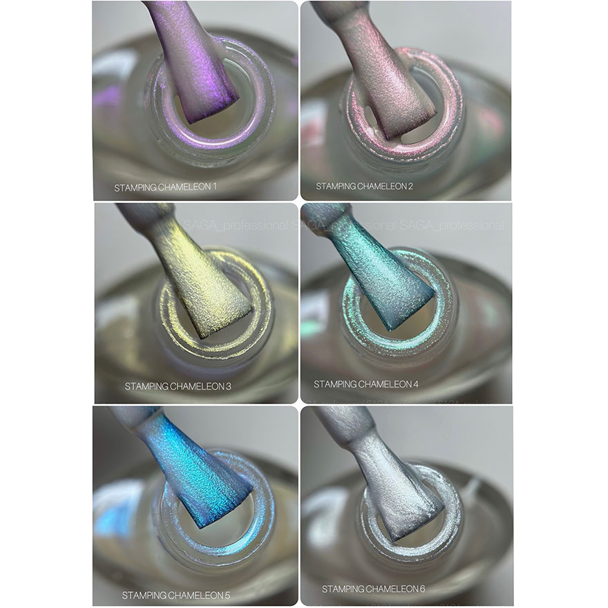 Saga Professional Stamping Paint Chameleon - лак-фарба, призначена для стемпінг-дизайну будь-якого рівня складності. Містить високу концентрацію кольорового пігменту для яскравих і контрастних малюнків. Володіє оптимальною консистенцією, яка дозволяє повноцінно заповнювати найдрібніші деталі й елементи на пластинах та дисках, щоб візерунок переносився повністю і виглядав цілісним. У палітрі є всі найпопулярніші кольори, тому майстер зможе працювати і експериментувати легко та з задоволенням. А результат завжди буде радувати.