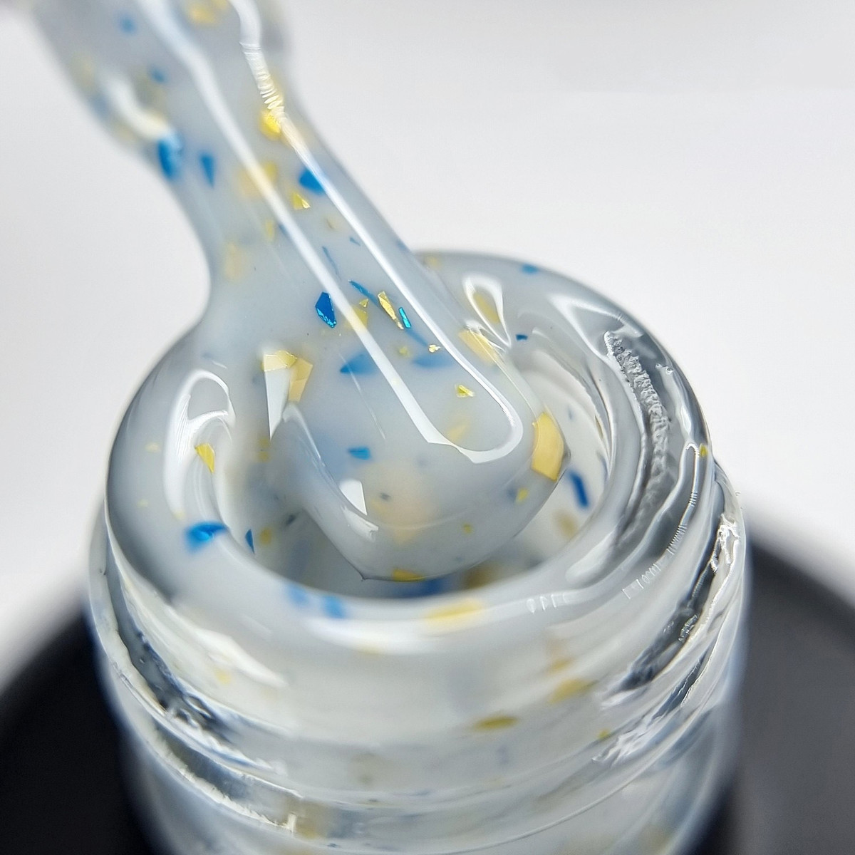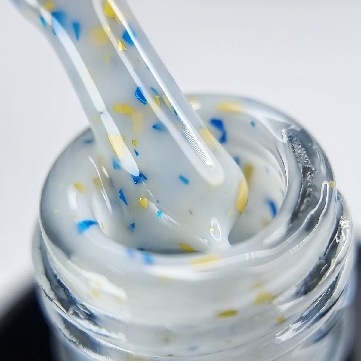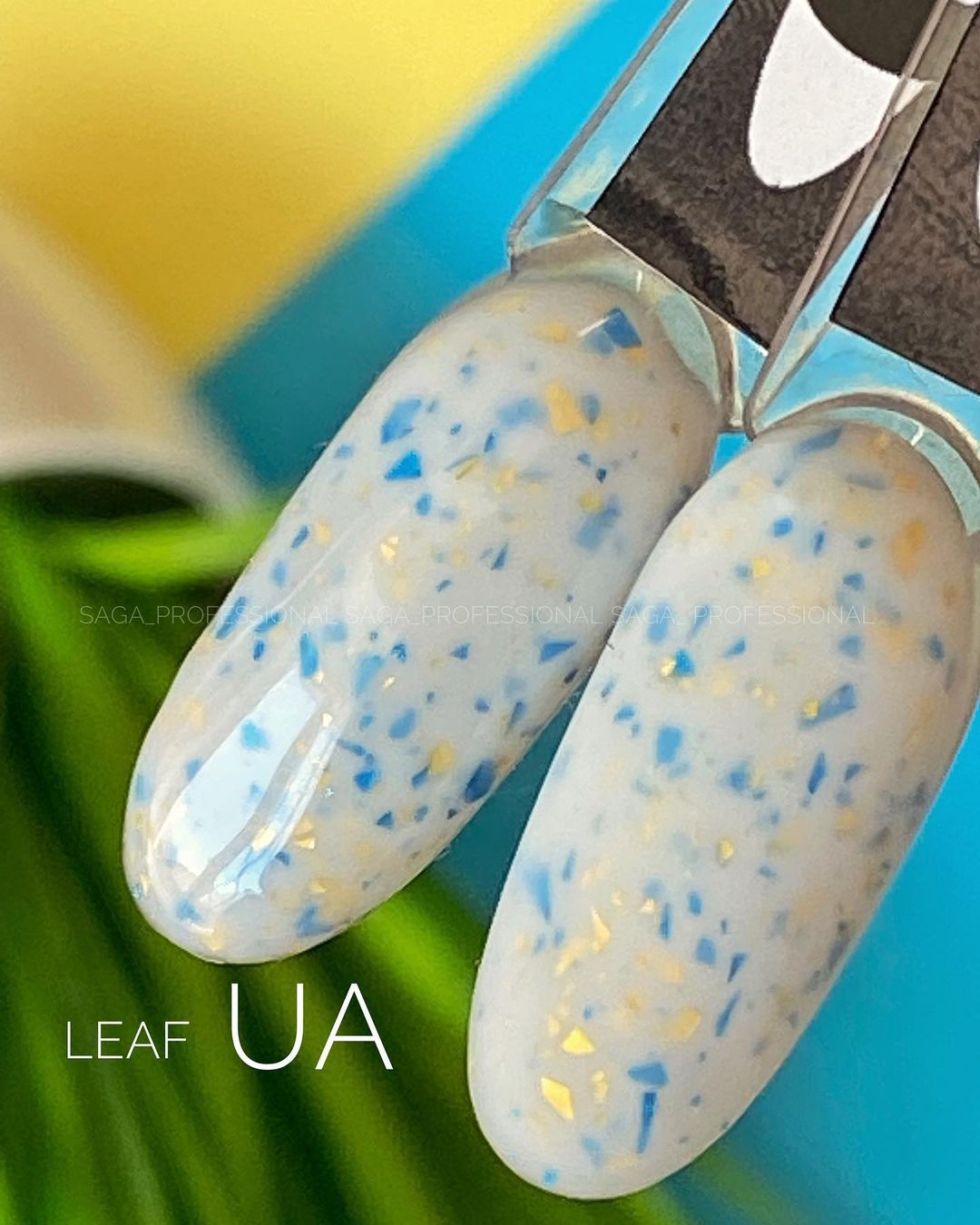Камуфлююча база Saga Leaf Base UA (молочний з жовто-блакитною поталлю) 30 мл – базове покриття, яке дозволяє надати відтінку натуральним нігтьовим пластинам. Легко наноситься, гарантує міцне зчеплення, запобігає відшаровуванню та сколам, приховуючи дрібні візуальні недоліки, роблячи поверхню більш рівною та гладкою. Засіб має середню по густоті консистенцію, наноситься легко і самовирівнюється, не вимагає додаткового опила, пластівці поталі рівно розподіляються по нігті і не стовбурчиться. Така база не обтяжує нігтьову пластину, з нею можна пропустити етап нанесення кольорового гель-лаку, при цьому манікюр виглядатиме елегантним та якісним.