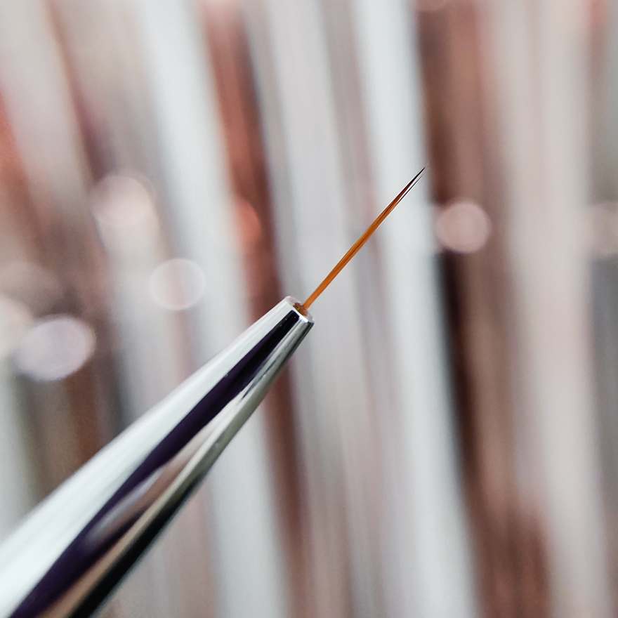 Ворсинки пензлика складаються з синтетичного матеріалу. Вони пружні і добре ковзають поверхнею нігтьової пластини. Ворсинки щільно прилягають одна до одної, створюючи тонкий пучок. Під час роботи пензлик для дизайну нігтів не розпушується, зберігає загострену форму.