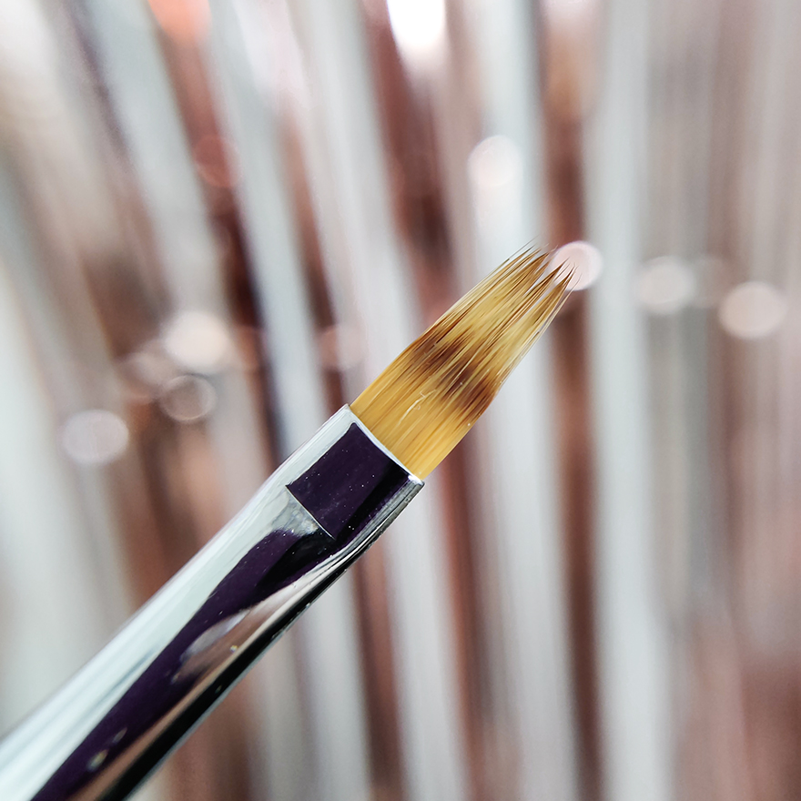 У пензлика рівний і плоский край, але всі волоски різняться по довжині. Така форма дозволяє створити плавний перехід кольорів. Ворсинки пензля складаються із синтетичного матеріалу. Вони в міру жорсткі, пружні та плавно ковзають поверхнею нігтьової пластини.