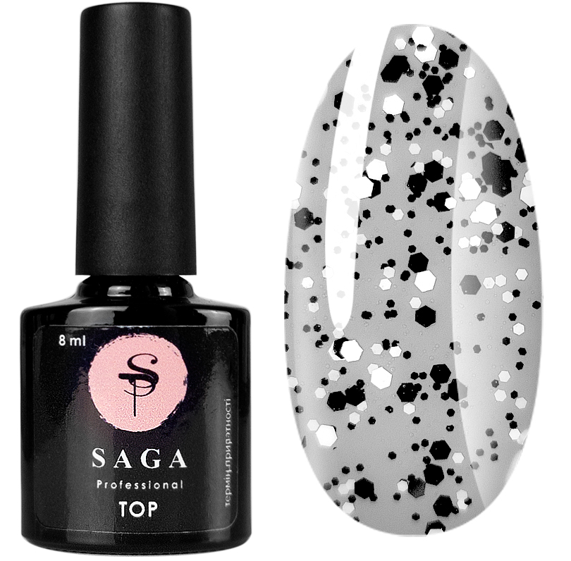Saga Professional Top Geometry – чудовий топ для гель-лаку без липкого шару. У його текстуру додані мерехтливі пластівці різного розміру та хаотичних форм. При нанесенні на будь-який колір гель-лаку цей фініш додає цікавих деталей та мерехтливих переливів. Виходить досить яскравий манікюрний дизайн без складних технік і за дуже короткий час. Навіть знімати липкий шар не доводиться, оскільки Saga Professional Top Geometry його не утворює. Економія часу та чудовий зовнішній вигляд манікюру гарантовані!