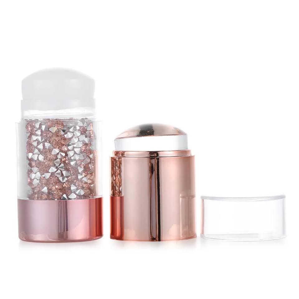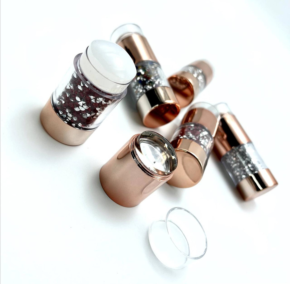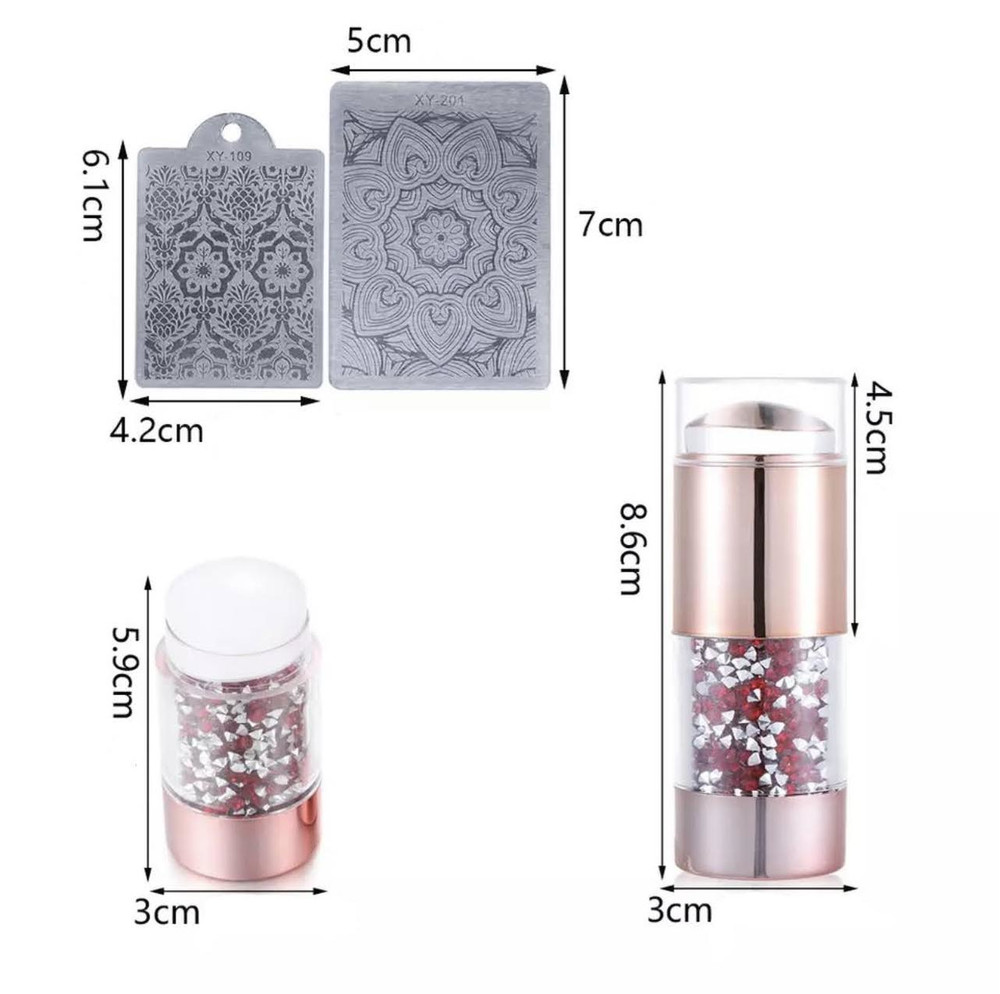 Набір для стемпінгу складається з великого штампу з двома подушками, виконаної з прозорого та матового силікону, пластикового скрапера та двох пластин різного розміру з малюнками-шаблонами. Такий штамп не потребує шліфування пилкою, а його прозорість з ефектом лінзи значно полегшує процес створення симетричних, акуратних та красивих стемпінг-узорів. Діаметр штампу великий, тому навіть найдовші нігтики можна декорувати з легкістю та комфортом. Особливу увагу привертає дизайн штампу, де головну роль відіграють кольорові стрази. Дивиться такий інструмент дуже круто!