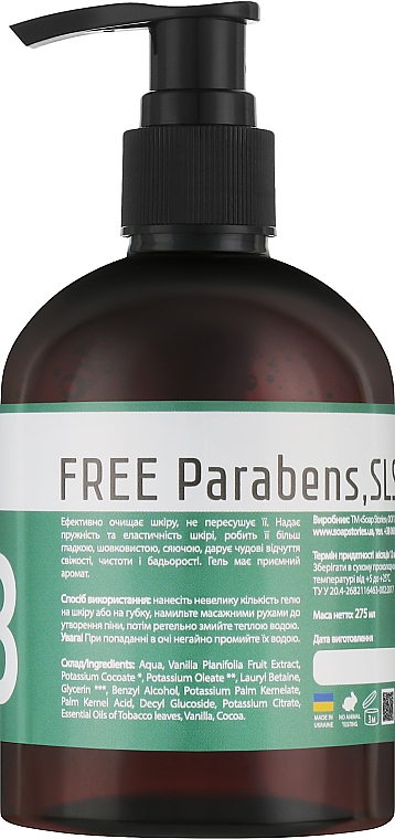 Пом'якшити шкіру та відновити її тонус легко з гелем для душу Green від бренду Soap Stories. У складі продукту – екстракт ванілі, олії тютюнового листя та какао, а також м'які миючі компоненти. Засіб ретельно очищає та розгладжує тканини, підвищує оптимальний рівень вологи та надає інтенсивну поживну дію. Легка консистенція утворює багату піну, відмінно змивається і не сушить шкірний покрив, залишаючи тонкий аромат, що обволікає.