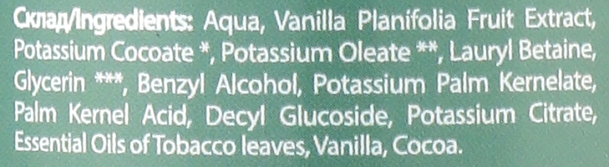 Aqua, Vanilla Planifolia Fruit Extract, Potassium Cocoate*, Potassium Oleate**, Lauryl Betaine, Glycerin ***, Benzyl Alcohol, Potassium Palm Kernelate, Palm Kernel Acid, Decyl Glucoside, Potassium Citrate, Essential Oils Of , Lemon Leaves, Violets, Basil And Bergamot.