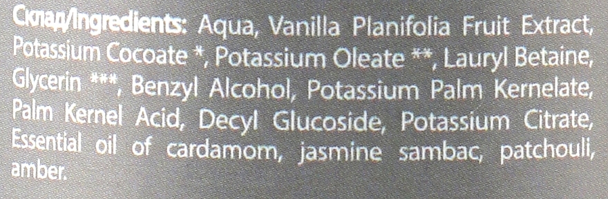 Aqua, Vanilla Planifolia Fruit Extract, Potassium Cocoate*, Potassium Oleate**, Lauryl Betaine, Glycerin ***, Benzyl Alcohol, Potassium Palm Kernelate, Palm Kernel Acid, Decyl Glucoside, Potassium Citrate, Essential Oils Of , Lemon Leaves, Violets, Basil And Bergamot.