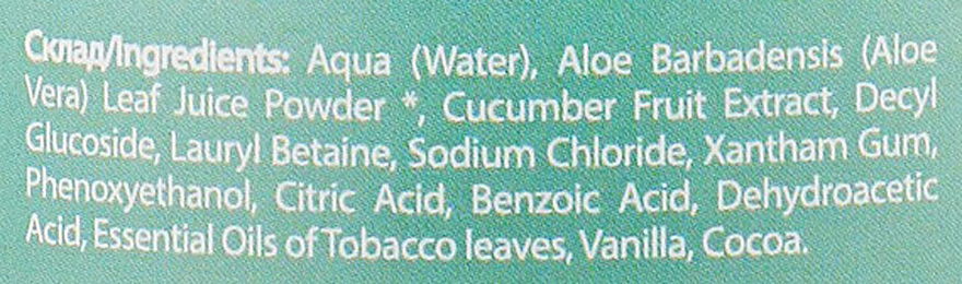 Aqua (Water), Aloe Barbadensis (Aloe Vera) Leaf Juice Powder *, Cucumber Fruit Extract, Decyl Glucoside, Lauryl Betaine, Sodium Chloride, Xantham Gum, Phenoxyethanol, Citric Acid, Benzoic Acid, Dehydroacetic Acid, Dehydroacetic Acid , Tangerine, Lemon Leaves, Violets, Basil And Bergamot.