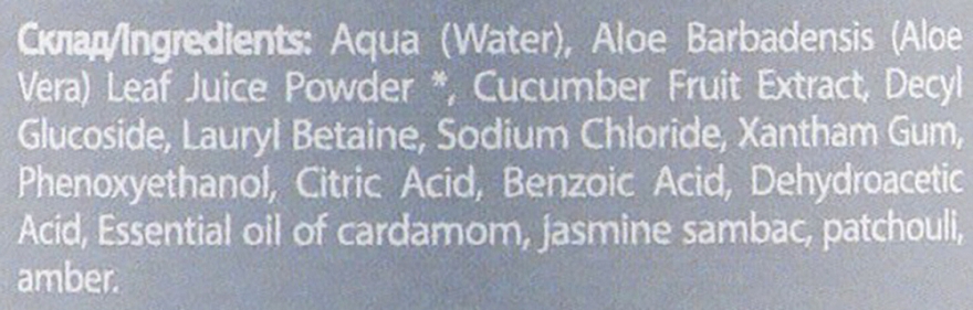 Aqua (Water), Aloe Barbadensis (Aloe Vera) Leaf Juice Powder *, Cucumber Fruit Extract, Decyl Glucoside, Lauryl Betaine, Sodium Chloride, Xantham Gum, Phenoxyethanol, Citric Acid, Benzoic Acid, Dehydroacetic Acid, Dehydroacetic Acid , Tangerine, Lemon Leaves, Violets, Basil And Bergamot.