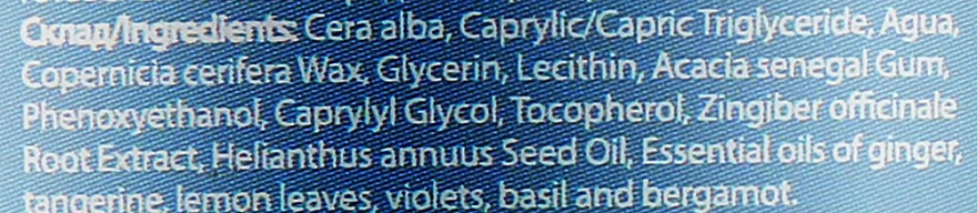Cera Alba, Caprylic/Capric Triglyceride, Agua, Copernicia Cerifera Wax, Glycerin, Lecithin, Acacia Senegal Gum, Phenoxyethanol, Caprylyl Glycol, Tocopherol, Zingiber Officinale Root Extract, Helianthus Annuus Seed Cocoa.