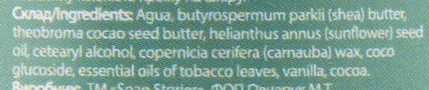 Agua, Butyrospermum Parkii (Shea) Butter, Theobroma Cocao Seed Butter, Helianthus Annus (Sunflower) Seed Oil, Cetearyl Alcohol, Copernicia Cerifera (Carnauba) Wax, Coco Glucoside, Essential Oil Of Cardamom, Jas.