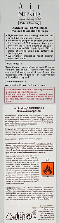 Інноваційний засіб у світі краси – тональний спрей для ніг від AirStocking. Тепер ваші ніжки будуть виглядати нереально привабливо, немов у найсексуальніших панчохах. До того ж ви не відчуватимете дискомфорт, а також зовсім позбавитеся неприємностей у вигляді затяжок, «стрілок» і дірок. Компактний балончик із «рідкими панчохами» зробить образ королівським. Формула засобу на 100% безпечна, тому підійде будь-якого типу шкіри. Всього кілька секунд — і ваші ніжки досконалі. Особливості AirStocking Premier Silk Spray: забезпечує надання шкірі гладкості і бархатистості;