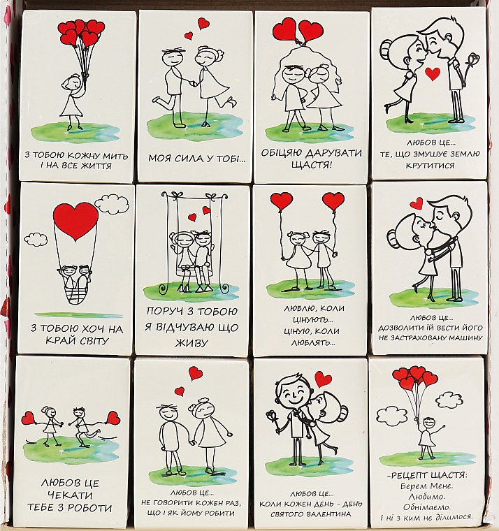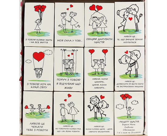 Кожен продукт від бренду Soap Stories – це унікальна історія, насичена турботою та любов'ю. Проявіть ці почуття до близької людини за допомогою набору натурального мила Love s... Оформлення 24 брусків – це роздуми на тему «Що таке кохання»? Бажання провести з близькою людиною кожну мить життя, дарувати щастя або довірити найцінніше – свою незастраховану машину.Незвичайний дизайн наповнює серце теплом та радісними емоціями. Не менш позитивне враження залишить і використання мил – натуральні інгредієнти забезпечують не тільки делікатне очищення, але й покращують стан шкіри, а аромати дарують справжню ольфакторну насолоду!