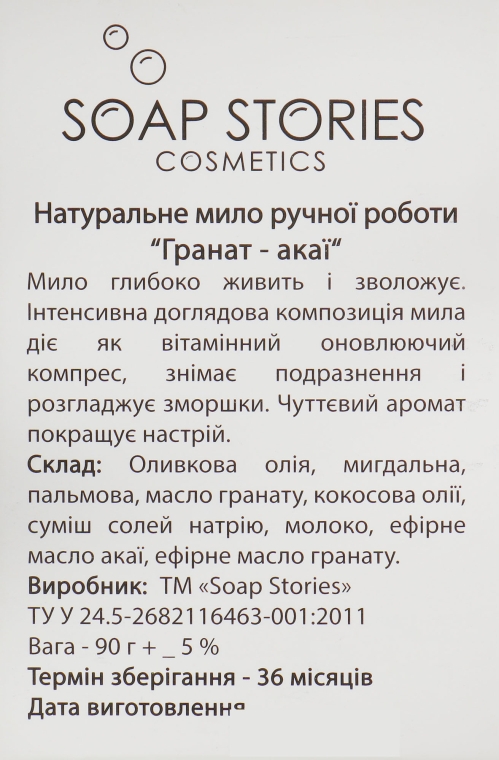 Гармонійне поєднання солодкувато-терпкого аромату гранату та ягідного звучання акаї подарують вам справжнє задоволення від водної процедури. Барвистий брусок мила від бренду Soap Stories дбайливо очищає шкіру від забруднень, насичує поживними компонентами і зволожує. Особлива формула мила діє як компрес, що оновлює, усуваючи роздратування і допомагаючи розгладити зморшки. Чуттєвий аромат мила подарує вам гарний настрій, навіє приємні спогади та збереже красу вашої шкіри!