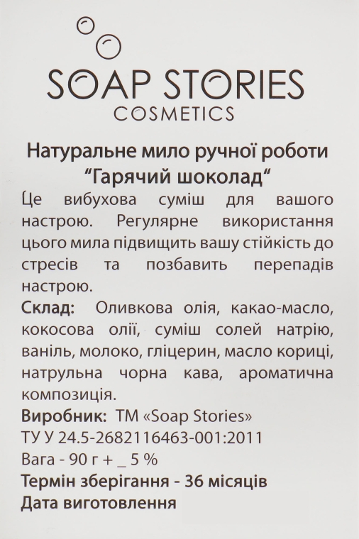 Що може бути приємнішим за чашки гарячого шоколаду, що зігріває? Відповідь проста: запашне мило з чудовим ароматом солодкого напою. Щоденні водні процедури із застосуванням симпатичного бруска мила кавово-бежевого відтінку подарують вам задоволення та відчуття релаксації. Активні компоненти мила м'яко очищають шкіру від забруднень, залишаючи відчуття свіжості, комфорту та чистоти. Аромат гарячого шоколаду допоможе позбутися перепадів настрою, підвищить стресостійкість і навіє найсолодші спогади!