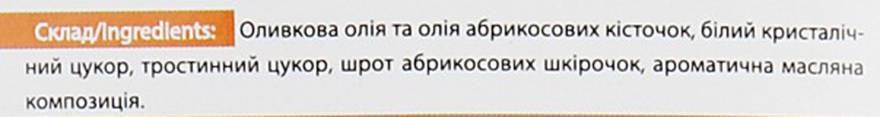 оливкова олія та олія абрикосових кісточок, солі Мертвого та Чорного морів, шрот абрикосових шкурок, ароматична олійна композиція.