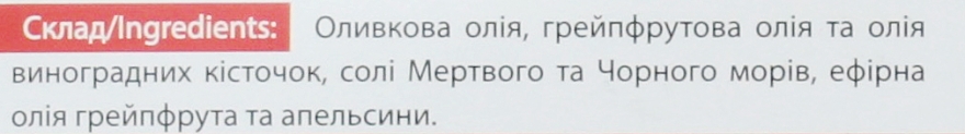 Оливкова олія, грейпфрутова та олія виноградних кісточок, солі Мертвого та Чорного морів, ефірні олії грейпфрута та апельсина.