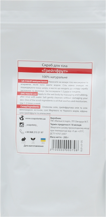 Ароматну лінійку скрабів від українського бренду «Soap Stories» створено з турботою про здоров'я споживачів, а також про красу їхньої шкіри. Ці натуральні засоби догляду містять поживні елементи, якими насичують епідерміс. Завдяки такому догляду шкіра буде очищена, тонізована, а також приємна на дотик. Аромат терпкого грейпфрута бадьорить і чудово освіжає. ;