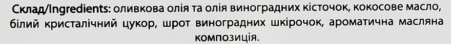 Оливкова олія та олія винограних кісточок, солі Мертвого та Чорного морів, шрот виноградних шкурок, ароматична олійна композиція.