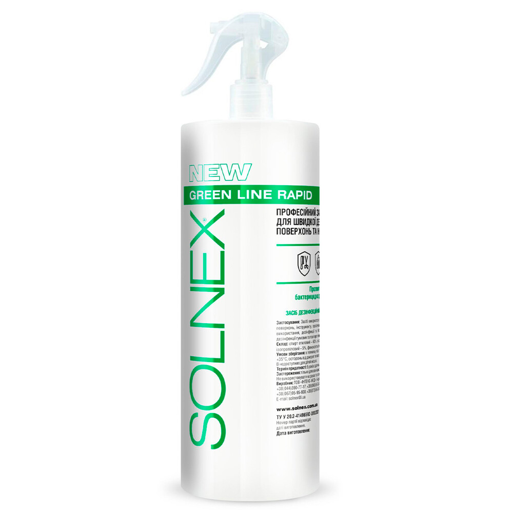 Швидкий дезінфікуючий засіб для поверхонь та інструментів Solnex Green Line Rapid з розпилювачем, 1000 мл