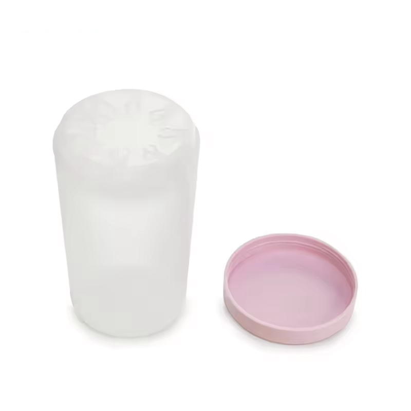 Склянка для пензлів пластикова з рожевою кришкою та тримачами.