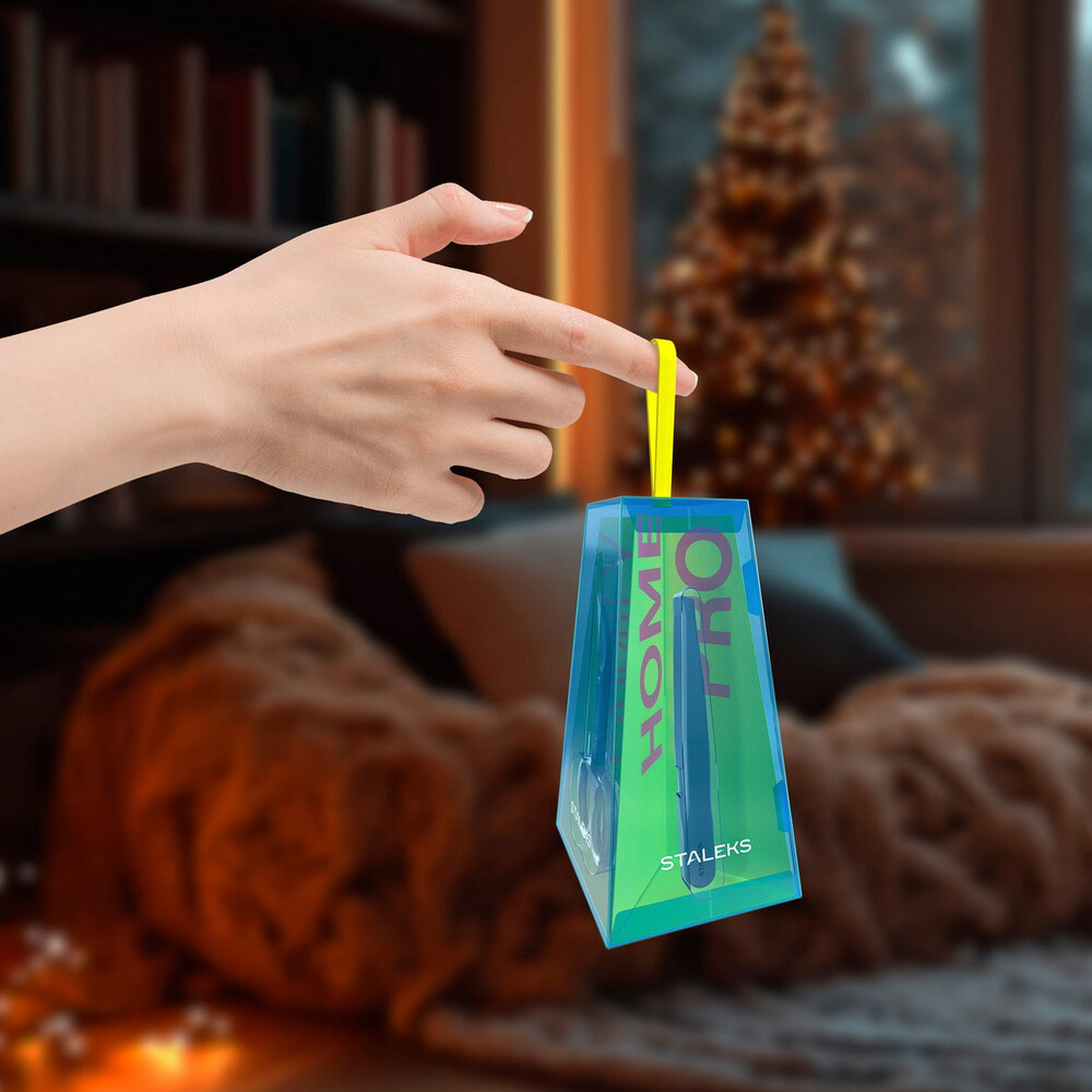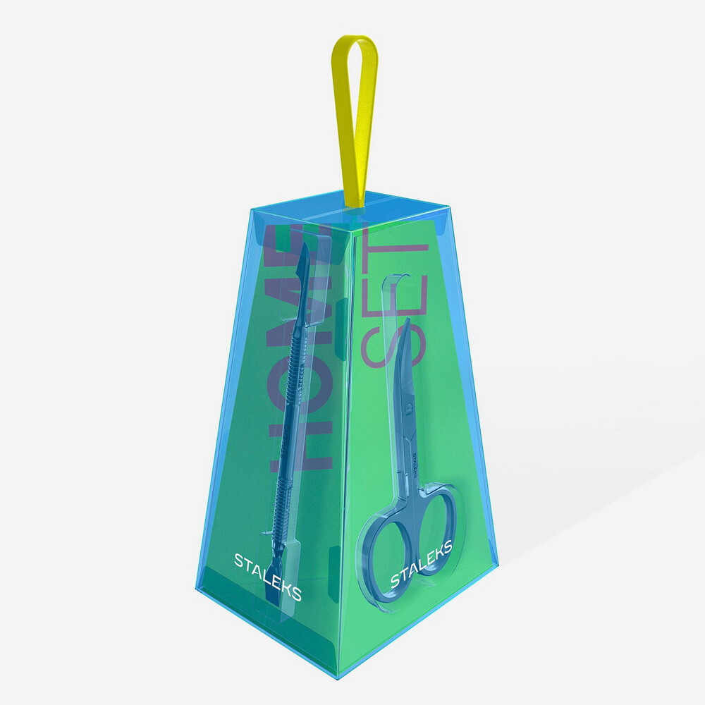 - Набір упакований у яскраву пластикову коробку у вигляді усіченої піраміди з логотипом Staleks. Така упаковка не тільки захищає інструменти від пошкоджень, а й привертає увагу своїм незвичайним дизайном, що робить набір ідеальним та корисним подарунком для себе та близьких.