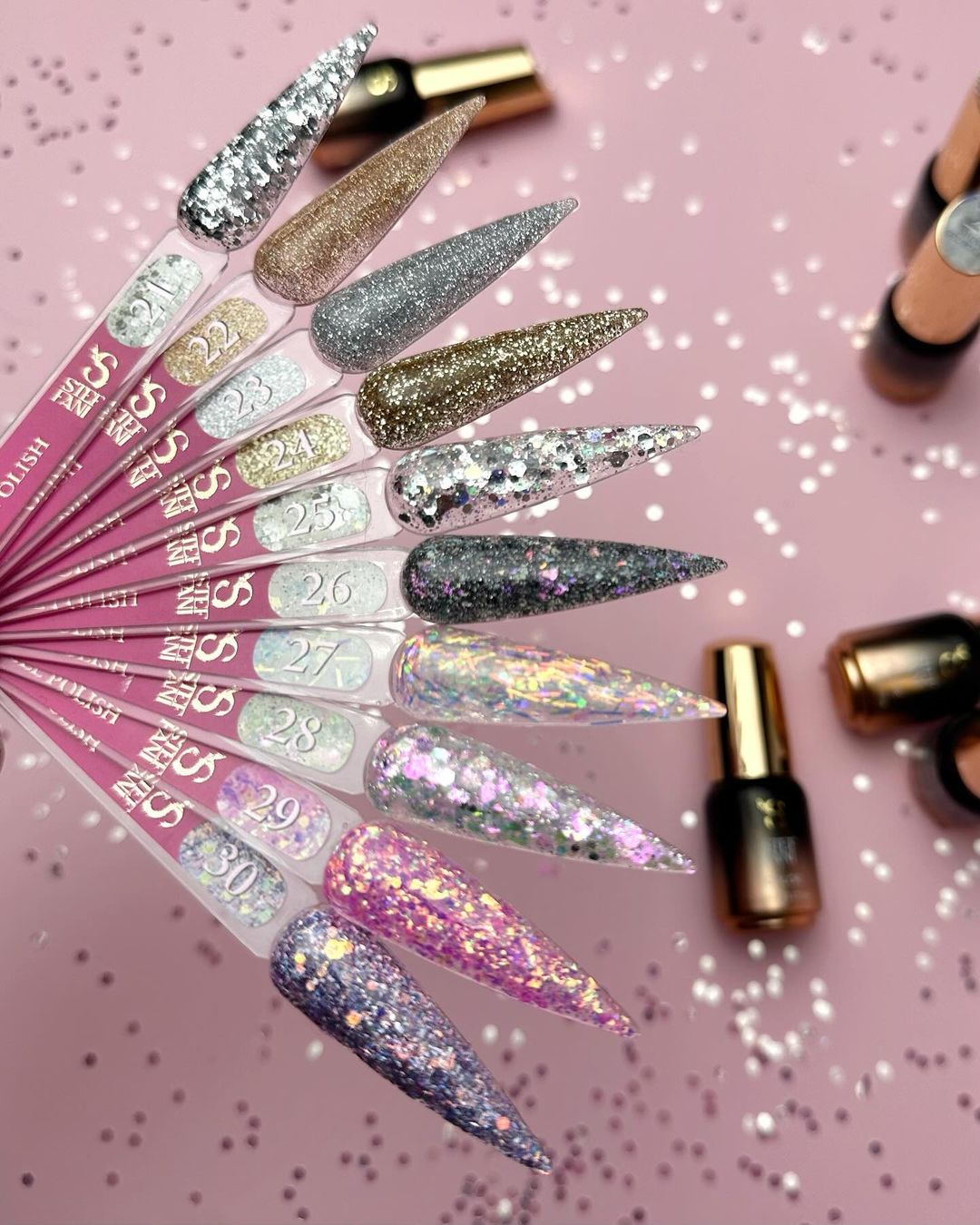 Shine Gel Polish Steffani – це колекція із 70 блискучих гель-лаків. Завдяки пігментації високої якості, гель-лак з блискітками дозволяє створювати ідеальне покриття нігтьової пластини, навіть, одним тонким шаром. Він має костинсенцію середньої густини, не розтікається та не потрапляє під кутикулу. Ці блискітки різного розміра та форми, рівномірно розподіляються по поверхні нігтів, розподіляючись рівним шаром та надаючи їм бездоганний вигляд. Створені для дизайнів та однотонного нанесення – це справжній рай для творчості в манікюрі. Завдяки своїй консистенції та різним кольорам, вони приречені на яскравий настрій!