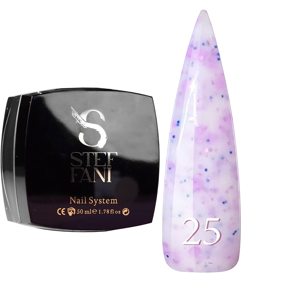 База камуфлююча для гель-лаку Steffani Cover Base 25, колір - молочний з фіолетовими конфетті та блискітками.