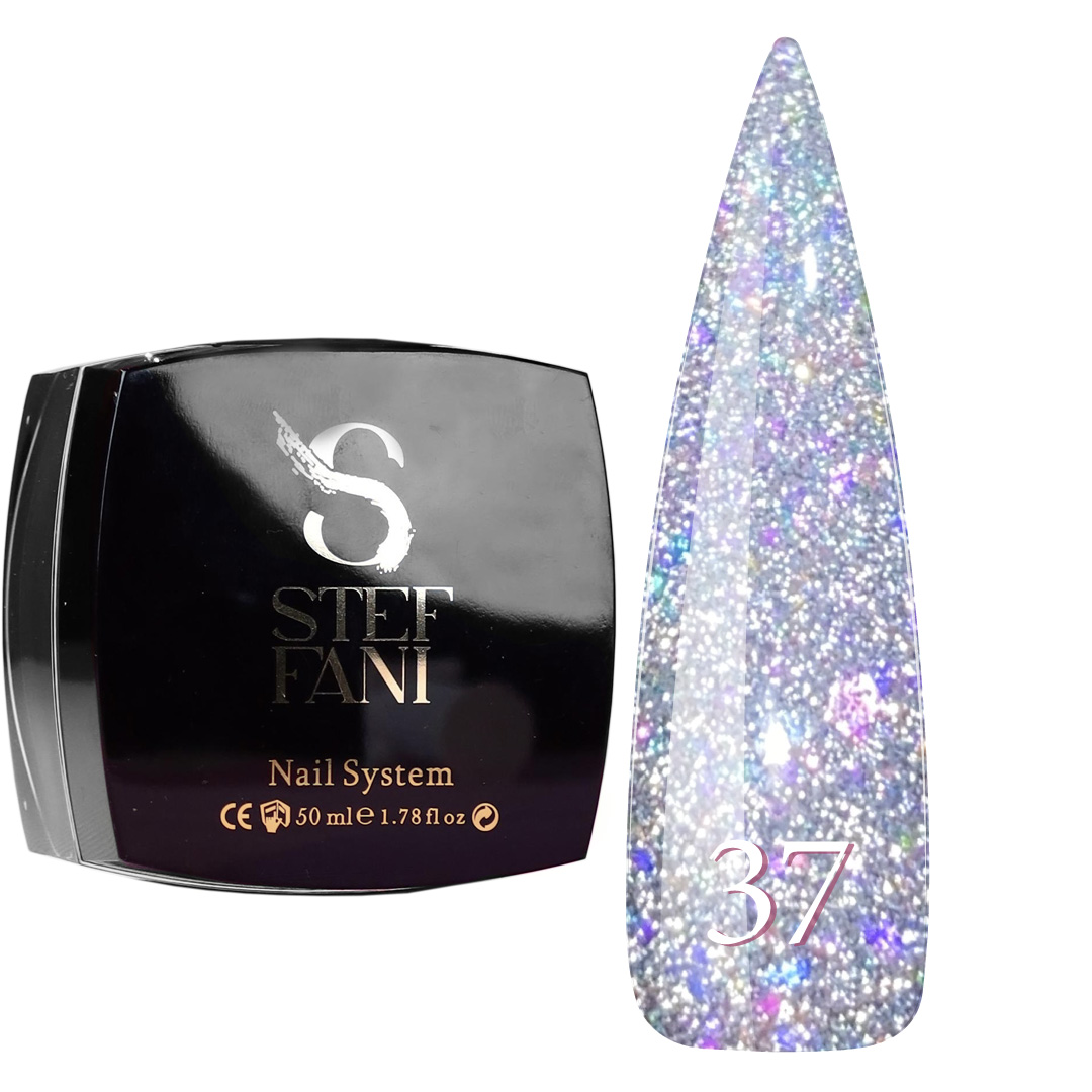 База камуфлююча для гель-лаку Steffani Cover Base 37 світловідбиваюча, колір - мікс рожевих блискіток і сріблястого шимера на прозорій основі.