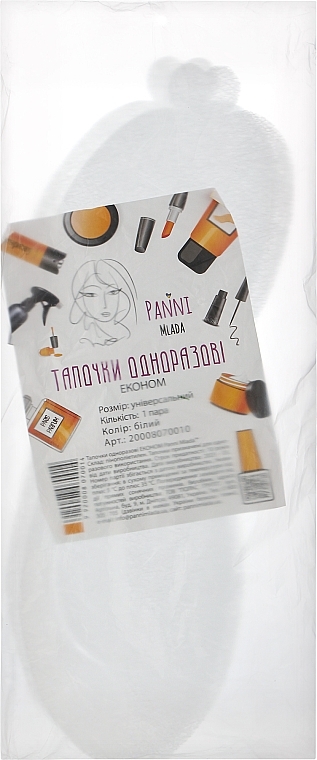 Panni Mlada Econom (білий) 1 пара універсального розміру – одноразові тапочки білого кольору. Призначені для салонів краси, спа, тату салонів, готелів та ін. Забезпечують гігієнічність під час виконання педикюрних, косметологічних та інших процедур.