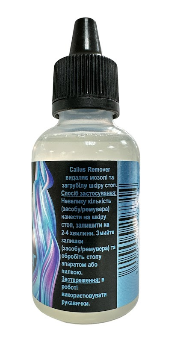 Нанести невелику кількість пензликом на шкіру стоп, залишити засіб на 2-4 хвилини, змити залишки засобу та обробити стопи пилкою або апаратом