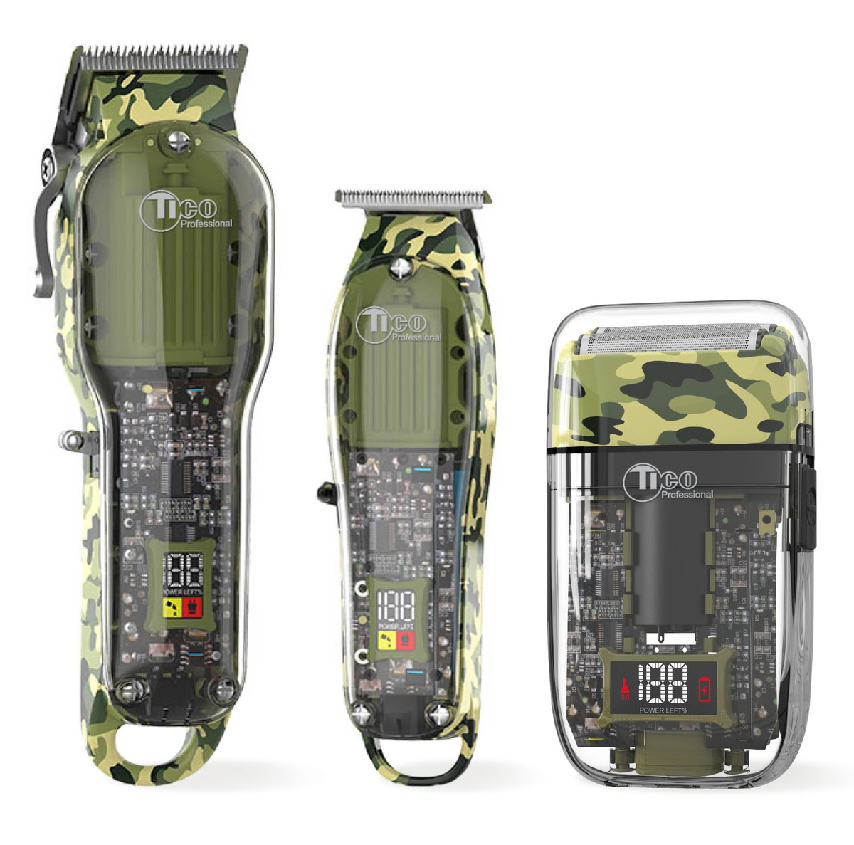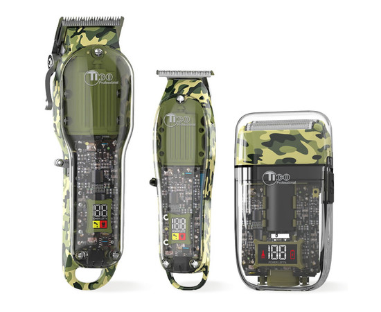 Набір машинок TICO Professional 100438 Military – чудовий набір для стрижки волосся, який, безсумнівно, сподобатися будь-якій людині, яка цінує оригінальність та незвичайні рішення. Всі інструменти мають прозору кришку, яка не приховує електронні компоненти кожного виробу.