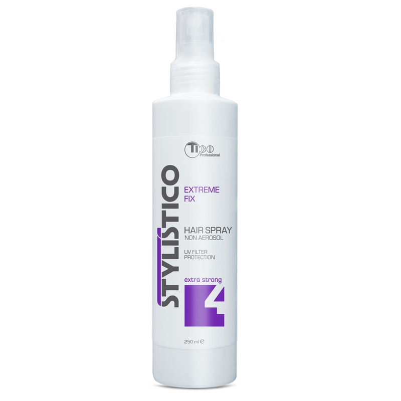 Спеціальна формула рідкого лаку для волосся захищає волосся від УФ-променів та підвищеної вологості і дозволяє зберегти зачіску навіть у вологу погоду. Надає волоссю природний блиск і не обтяжує його. Доглядаючий та захисний комплекс інгредієнтів у складі лаку нейтралізує статичну електрику на волоссі, зволожує, зміцнює пошкоджене та ламке волосся, надає їм об'єму. Лак спрей має приємний нейтральний аромат. Легко видаляється з волосся за допомогою гребінця-щітки, не залишаючи нальоту. Особливості застосування рідкого лаку для волосся екстра сильної фіксації STYLISTICO Extreme Fix при укладанні «важких» і волосся, що погано тримає, злегка збризнути лаком в прикореневу зону на вологе волосся і приступити до укладання феном, використовуючи техніку брашинга; при укладанні дифузором лак розпорошити на вологе волосся і сформувати локони.Можна розглядати як альтернативу пінки;