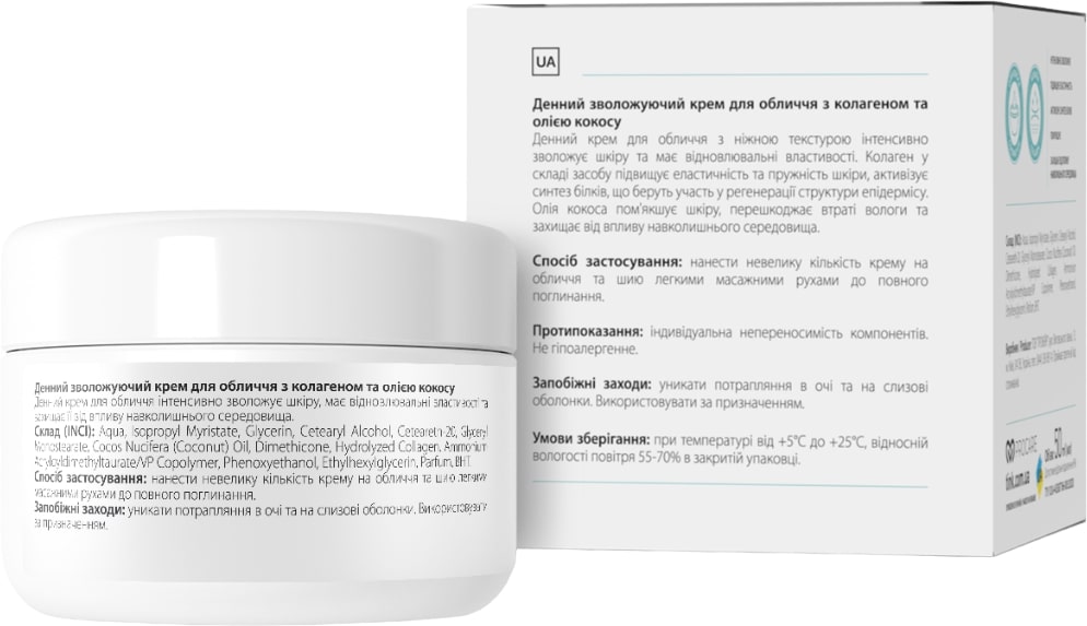 Денний крем для обличчя з ніжною текстурою інтенсивно зволожує шкіру та має відновлювальні властивості. Колаген у складі засобу підвищує еластичність та пружність шкіри, активізує синтез білків, що беруть участь у регенерації структури епідермісу. Олія кокоса пом'якшує шкіру, перешкоджає втраті вологи та захищає від впливу навколишнього середовища.