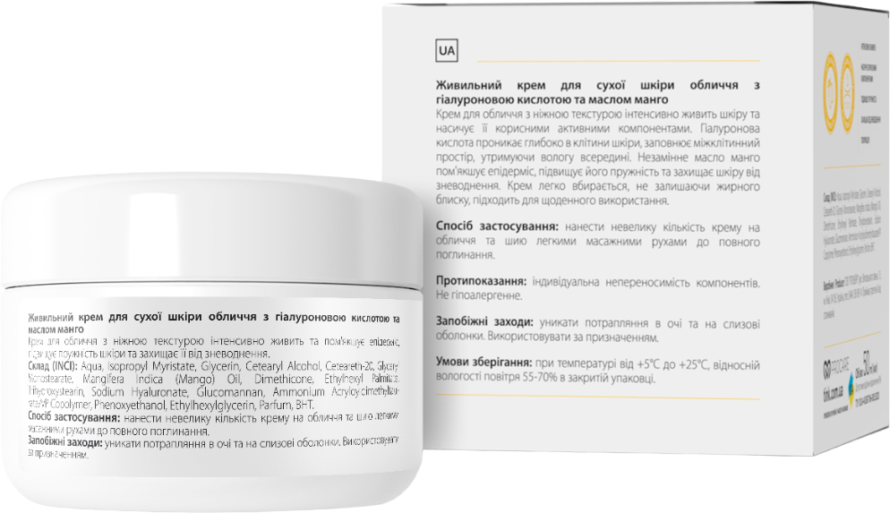 Крем для обличчя з ніжною текстурою інтенсивно живить шкіру та насичує її корисними активними компонентами. Гіалуронова кислота проникає глибоко в клітини шкіри, заповнює міжклітинний простір, утримуючи вологу всередині. Незамінне масло манго пом'якшує епідерміс, підвищує його пружність та захищає шкіру від зневоднення. Крем легко вбирається, не залишаючи жирного блиску, підходить для щоденного використання.