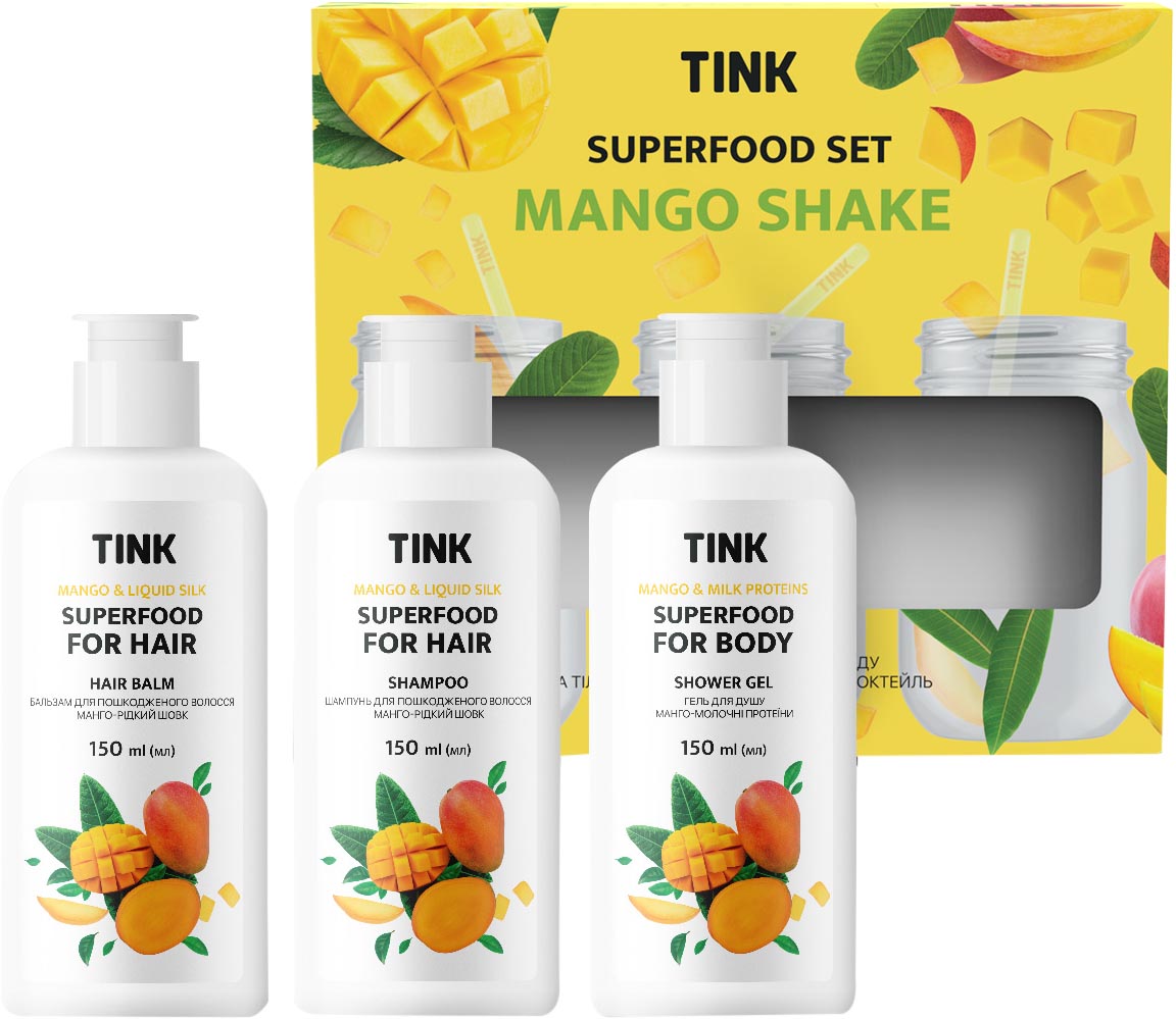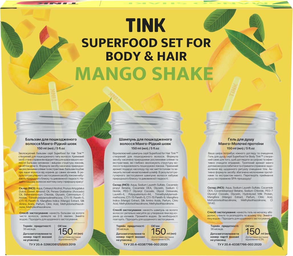 Подарунковий набір Superfood Set Mango Shake Tink™ з трьох засобів містить ніжний гель для душу з ароматом манго, шампунь та бальзам для пошкодженого волосся з рідким шовком. Тріо засобів по догляду за тілом та волоссям стануть чудовим подарунком та проявом турботи.