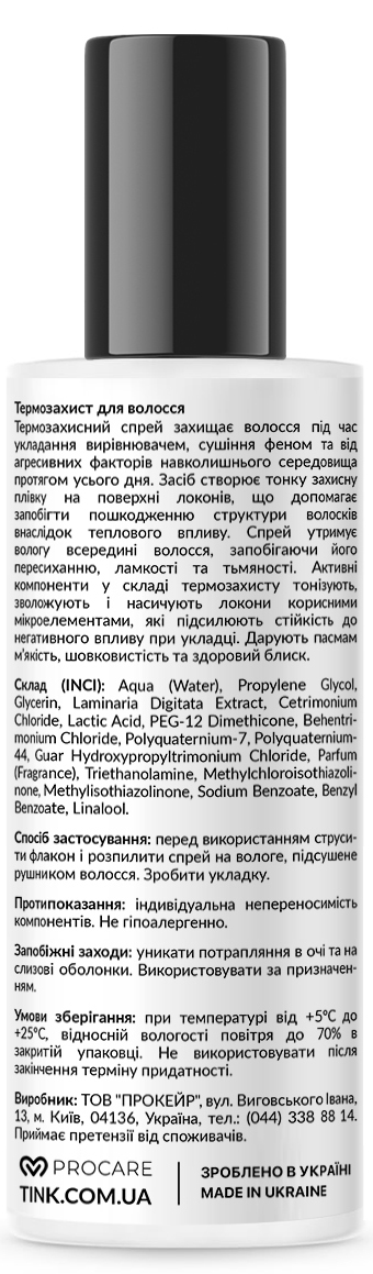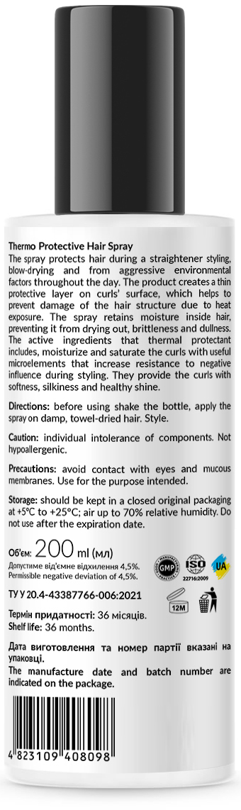 Термозахисний спрей захищає волосся під час укладання вирівнювачем, сушіння феном та від агресивних факторів навколишнього середовища протягом усього дня. Засіб створює тонку захисну плівку на поверхні локонів, що допомагає запобігти пошкодженню структури волосків внаслідок теплового впливу. Спрей утримує вологу всередині волосся, запобігаючи його пересиханню, ламкості та тьмяності. Активні компоненти у складі термозахисту тонізують, зволожують і насичують локони корисними мікроелементами, які підсилюють стійкість до негативного впливу при укладці. Дарують пасмам м’якість, шовковистість та здоровий блиск.