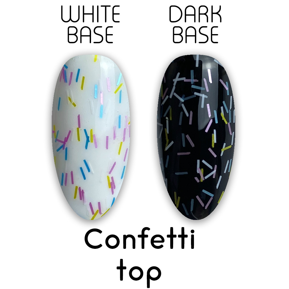 Це топ з кольоровою дрібною посипкою конфетті, яке ідеально прилягає до нього. Без липкого шару. Гармонійно виглядає з будь-яким кольором на нігтях.