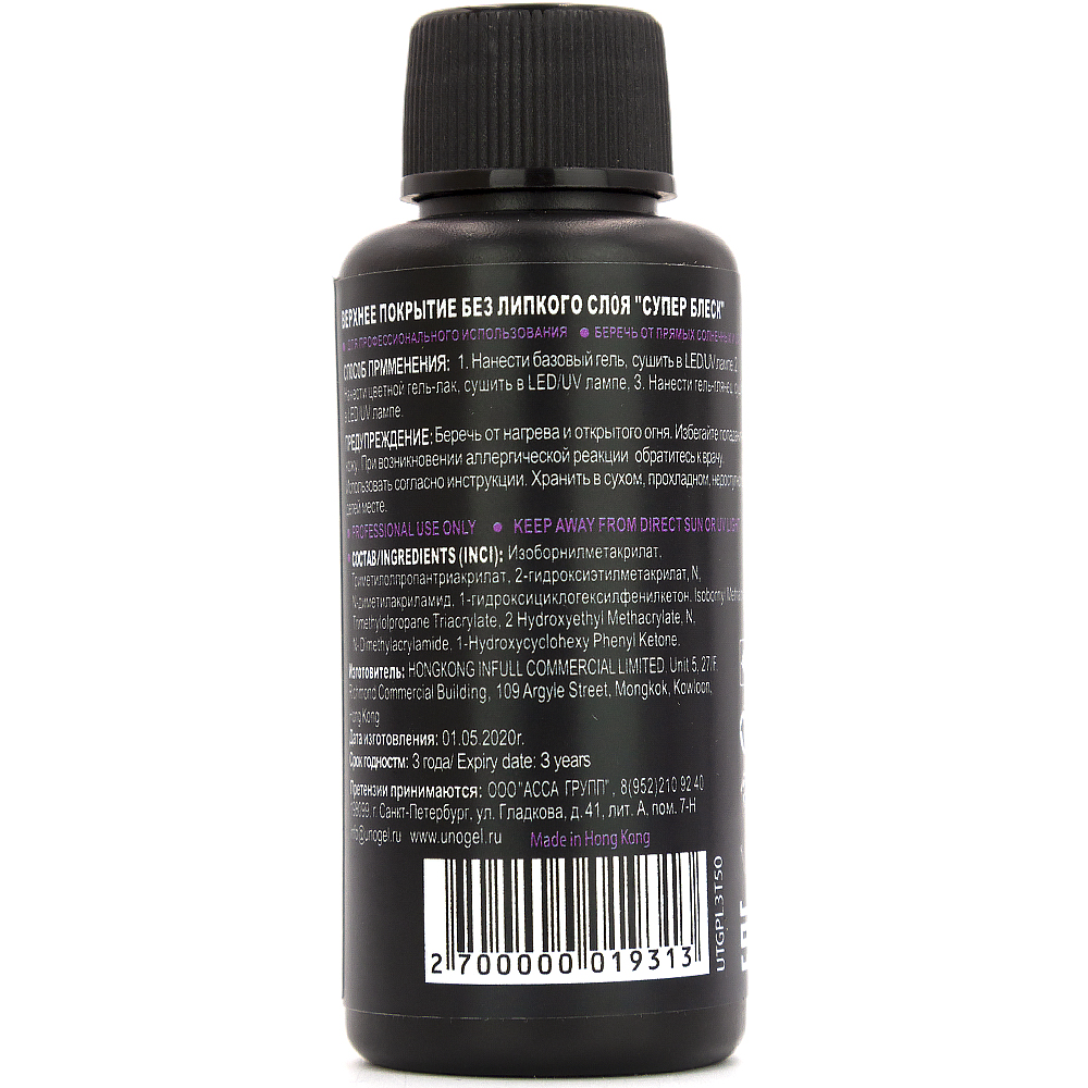 UNO Super Shine є високоякісним покриттям на каучуковій основі. Забезпечує тривале носіння без сколів і тріщин до 4х тижнів. Топ UNO захищає кольорове покриття від вигоряння і пожовтіння. Додатковою перевагою є відсутність липкого шару і, відповідно, необхідність знімати його додатковими засобами.