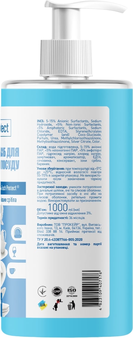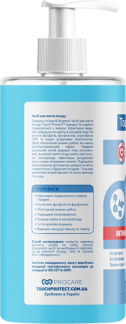 Завдяки потужній формулі засіб для миття посуду Touch Protect™ швидко та надійно справляється з жиром. Ефективно видаляє забруднення навіть в холодній воді. Не містить фосфатів, фосфонатів, агресивних ПАР та інших шкідливих компонентів. Засіб збагачений іонами срібла, які мають антибактеріальний ефект. Завдяки унікальній густій формулі гель економічний, дозволяє мити посуд навіть при низькій температурі, ефективно розщеплює жир і усуває неприємні запахи. Підвищене піноутворення допомагає швидко та легко справлятися із брудним посудом. Гель має приємний свіжий аромат та ніжну кремову текстуру.