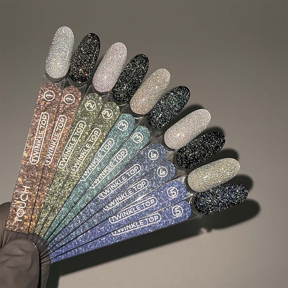 TOUCH TWINKLE TOP – це колекція топів без липкого шару з легким дрібним світловідбиваючим шимером та кольоровим напівпрозорими блискітками. Додає різноманітності покриттю завдяки ніжним переливам блискіток і згладжує нерівності.