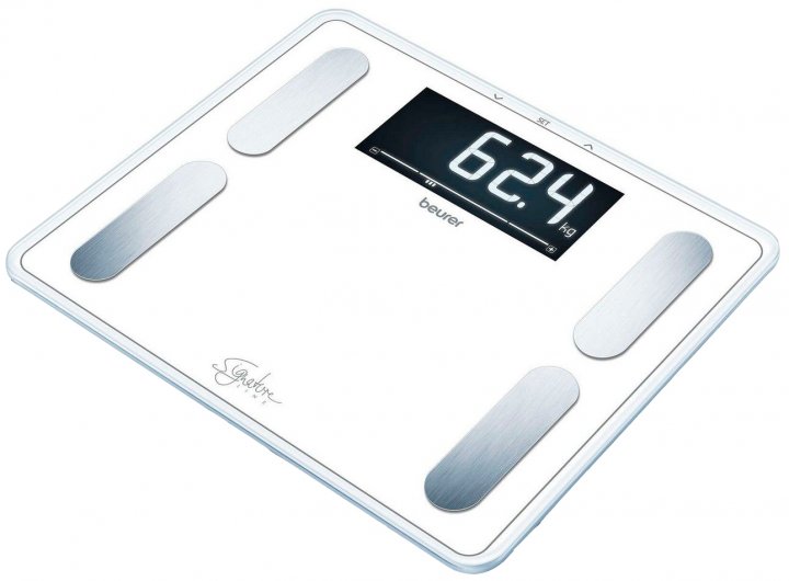Великі діагностичні ваги Beurer BF 410 зі збільшеною максимальною вагою та інтерпретацією результатів. Визначають вагу тіла, жирну масу, вміст води в організмі, м'язову масу, кісткову масу, визначають обмін речовин і рівень фізичної активності (BMR/AMR), розраховують індекс маси тіла.
