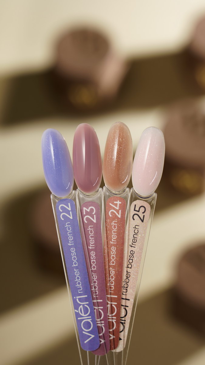 French Base Valeri – це високоякісні еластичні камуфлюючі бази середньої густоти, які поєднують у собі чудові самовирівнюючі властивості та комфорт у роботі. Завдяки своїй унікальній формулі, вони ідеально приховують нерівності нігтьової пластини, створюючи бездоганний, рівномірний тон, що надає нігтям доглянутого та природного вигляду.