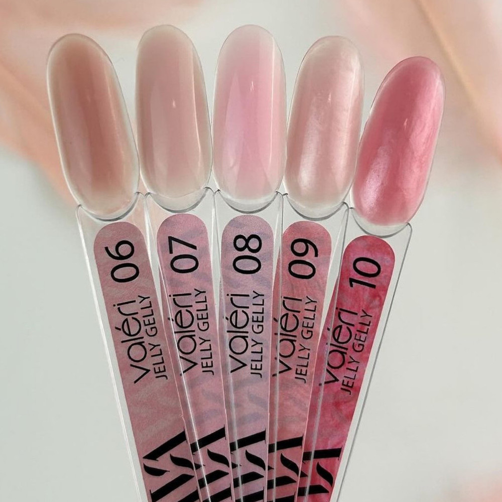 Valeri Jelly Gelly гель для нарощування нігтів — в палітрі 10 відтінків, білі, бежеві, рожеві та перламутрові варіації. Підходить для зміцнення чи нарощування на верхні форми.