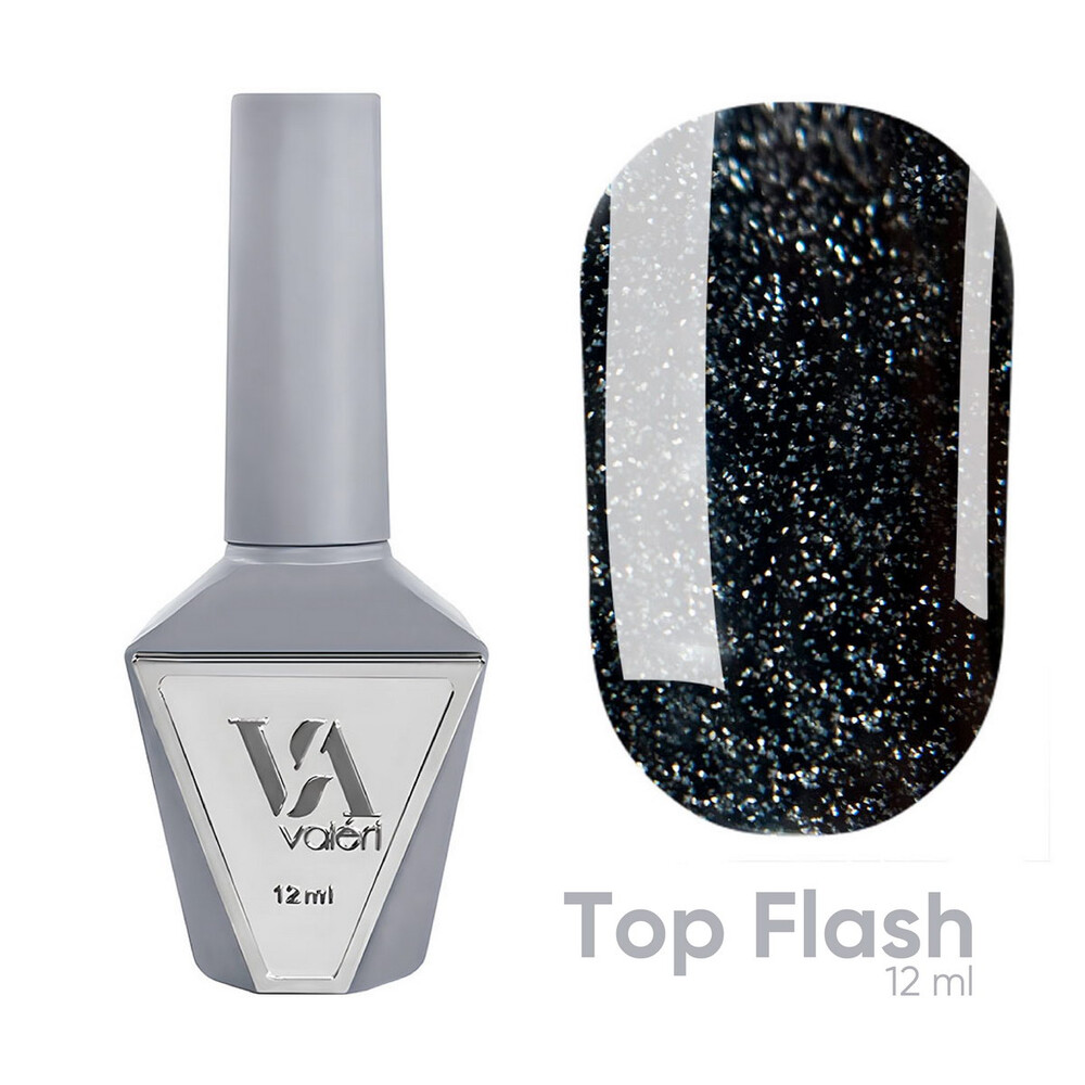 Valeri Top Flash – це фінішне покриття зі світловідбиваючими частинками, яке гарантує високу стійкість, надійно захищає нігтьову пластину від пошкоджень, відколів та тріщин.