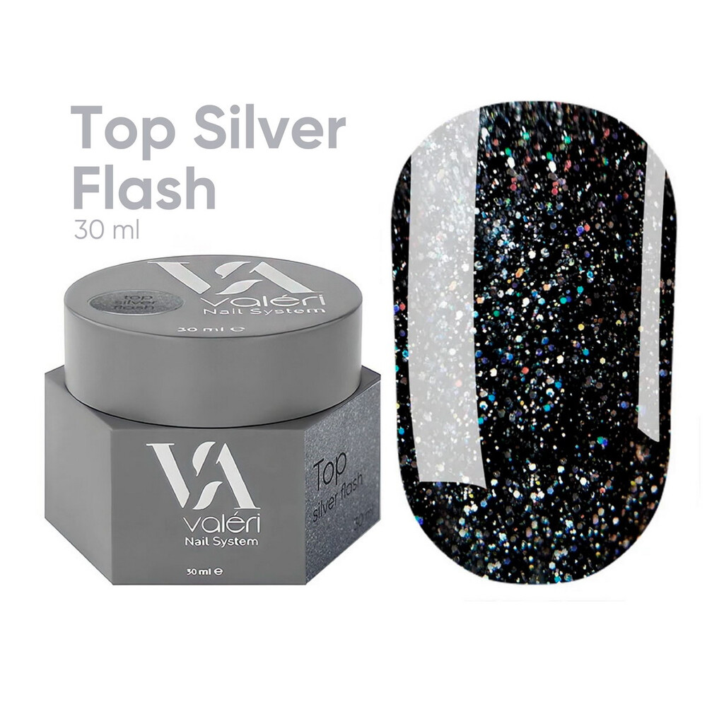 Valeri Top Silver Flash – це фінішне покриття зі світловідбиваючими частинками, яке гарантує високу стійкість, надійно захищає нігтьову пластину від пошкоджень, відколів та тріщин.